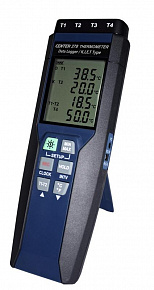 4 входа, термопара К-типа, -200 - 1370 °C/-328 - 2498 °F (с соответствующим датчиком), разрешение 0,1 °C/F, погрешность 0,1%, удержание, мин/макс, регистратор на 16000 показаний, USB с программой, подсветка дисплея, питание 1х9 В, 196 x 65 x 36 мм, масса 285 г