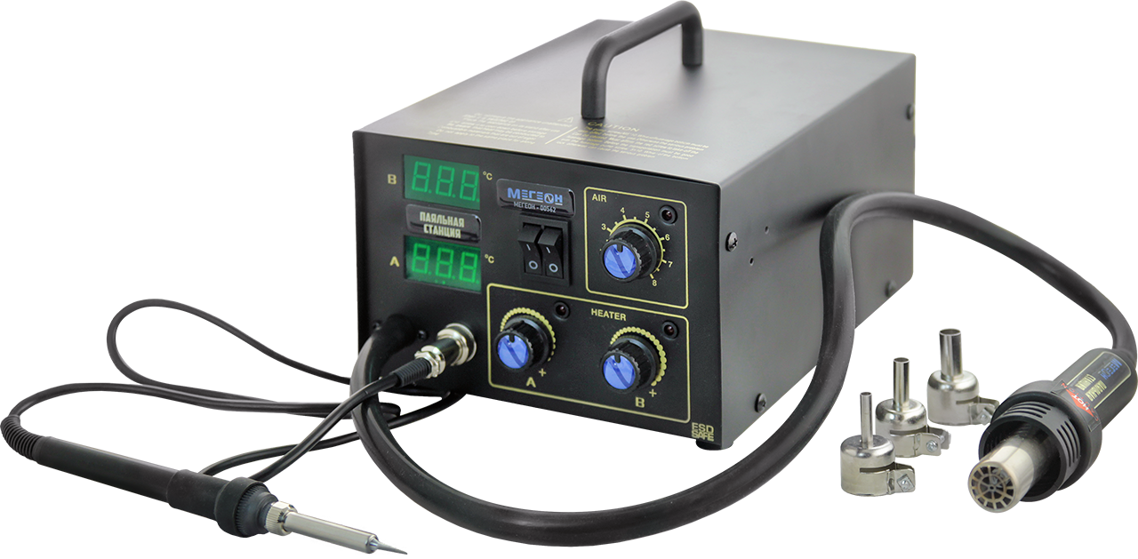 Паяльная установка МЕГЕОН 00562 представляет собой профессиональное оборудование для пайки электронных деталей и компонентов, предлагающее оптимальное решение для выполнения высококачественных паяльных работ. Данная модель оснащена термовоздушной установкой, способной быстро разогреваться и поддерживать стабильную температуру в пределах 0-420°C, позволяя адаптировать рабочие условия к различным типам материалов и компонентов. В комплекте также идет паяльник с жалом с рабочим температурным диапазоном 200-480°, что обеспечивает универсальность использования.
