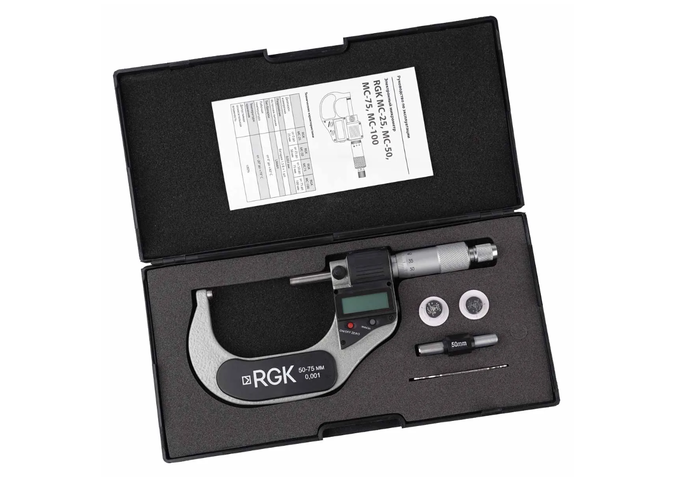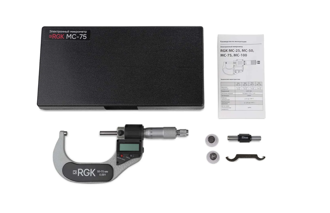 RGK MC-75, погрешность которого не превышает ±0,003 мм, служит для определения наружных размеров различных изделий в пределах от 50 до 75 мм, с разрешением 0,001 мм.