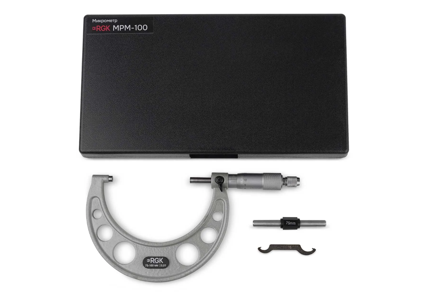 RGK MPM-100 предназначен для контроля геометрических параметров изделий, обеспечивая определение их наружных размеров в диапазоне от 75 до 100 мм с разрешением 0,01 мм.