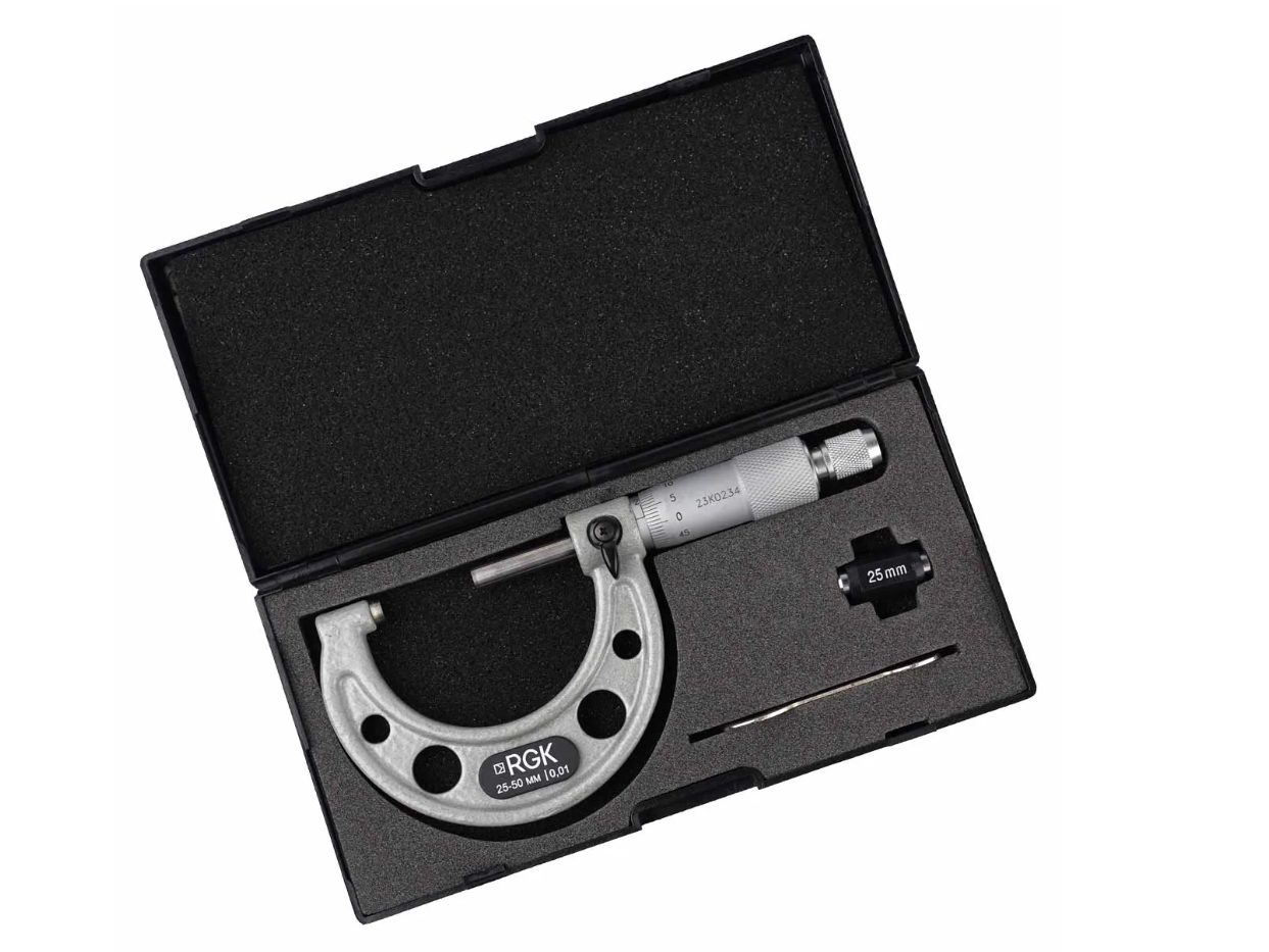 RGK MPM-50 – измерительный прибор с ценой деления 0,01 мм, предназначенный для контроля наружных размеров различных изделий в пределах от 25 до 50 мм.