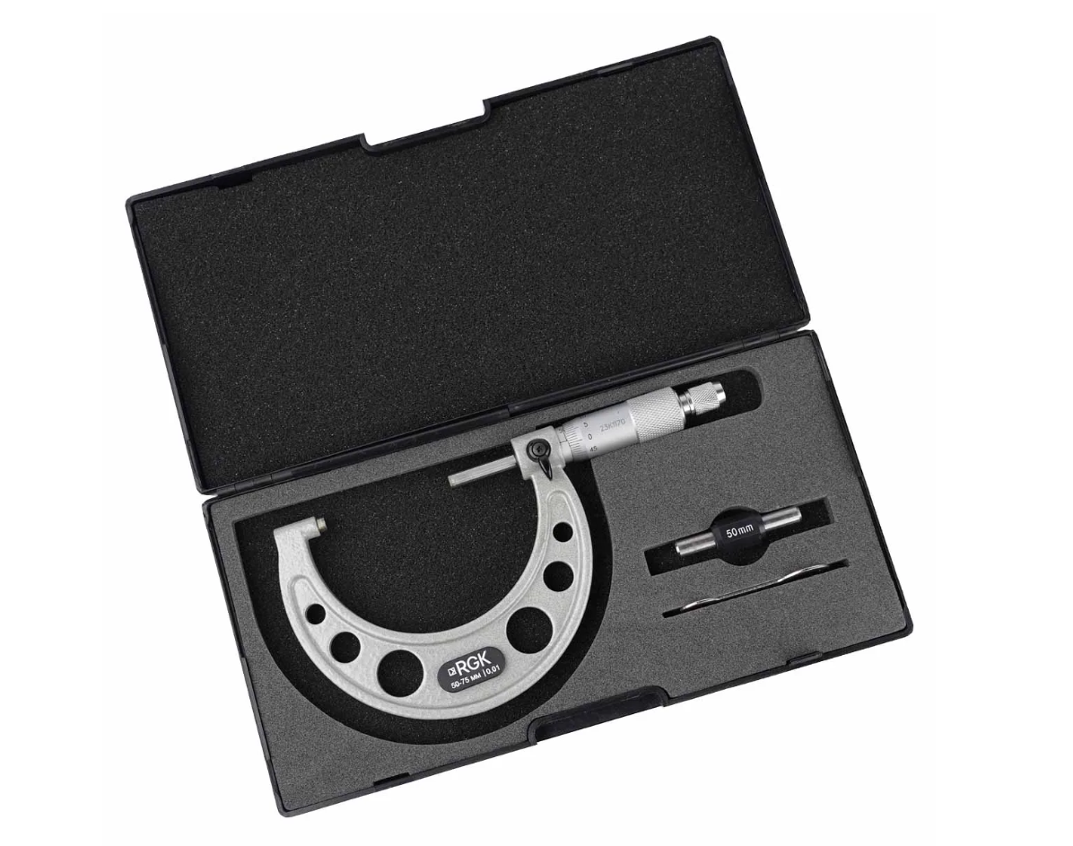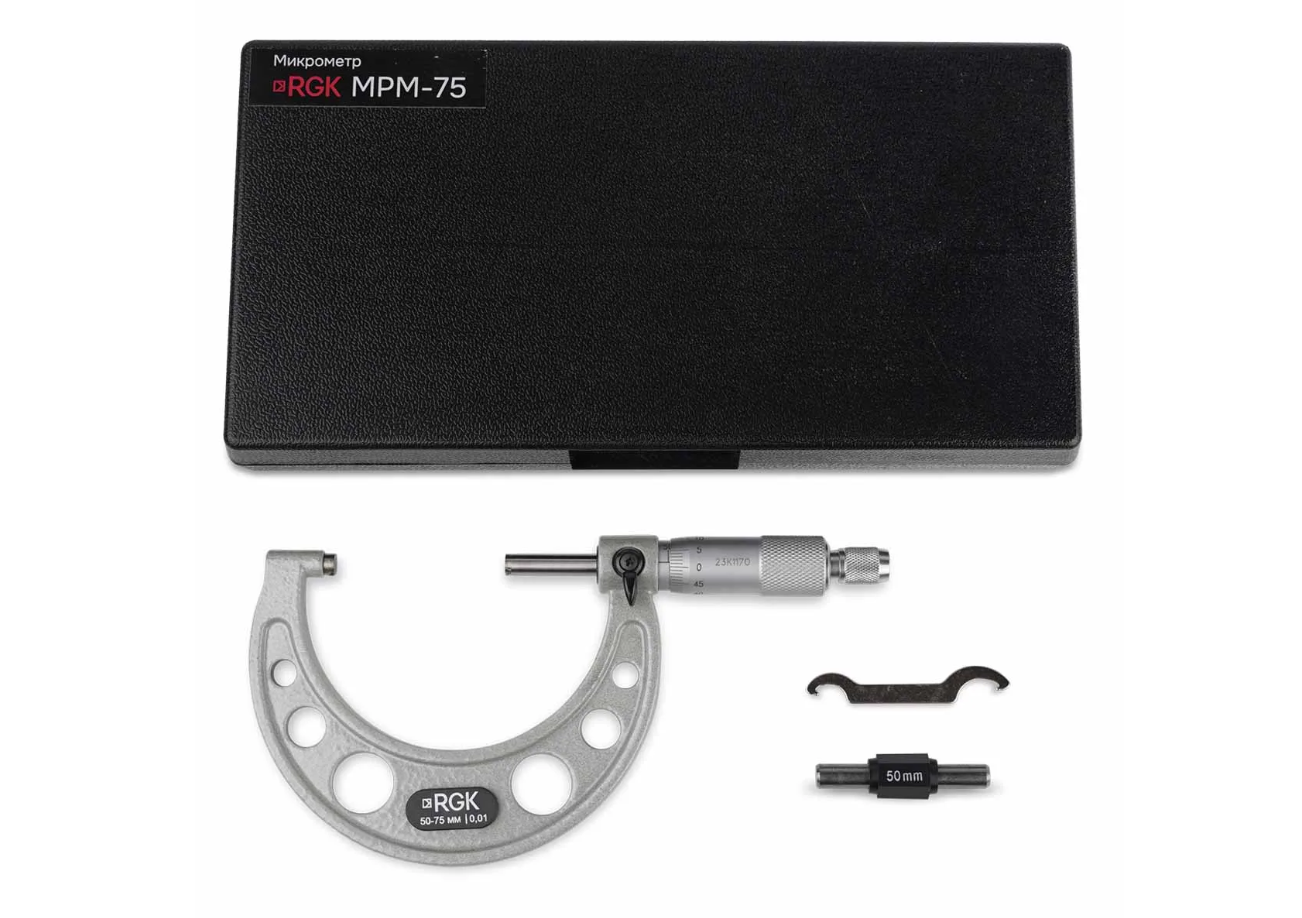 RGK MPM-75 – механический высокоточный прибор со скобой полукруглой формы. Модель предназначена для измерения наружных размеров в пределах от 50 до 75 мм.